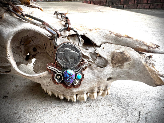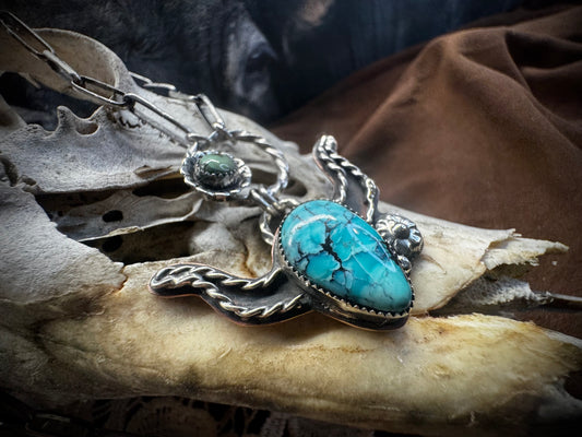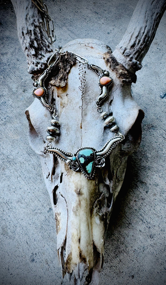 Hubei Turquoise and Pink Conch Silversmith Steer Necklace