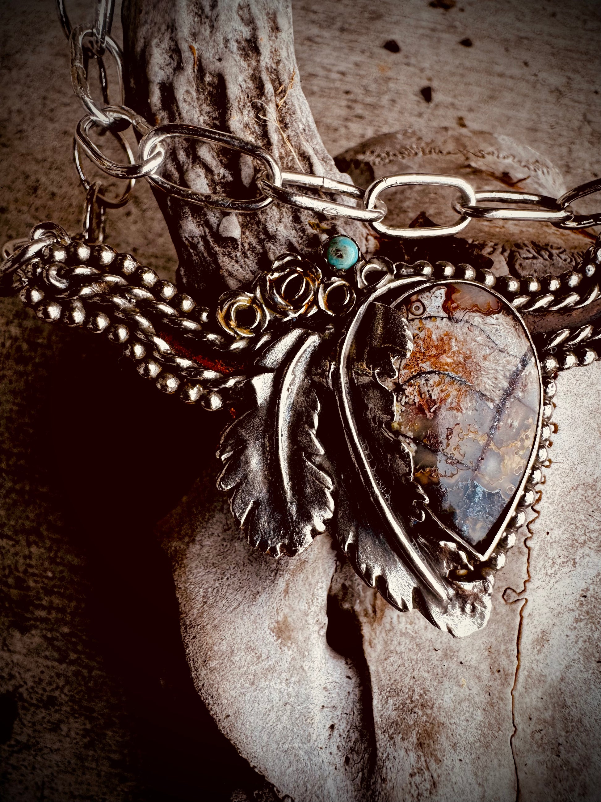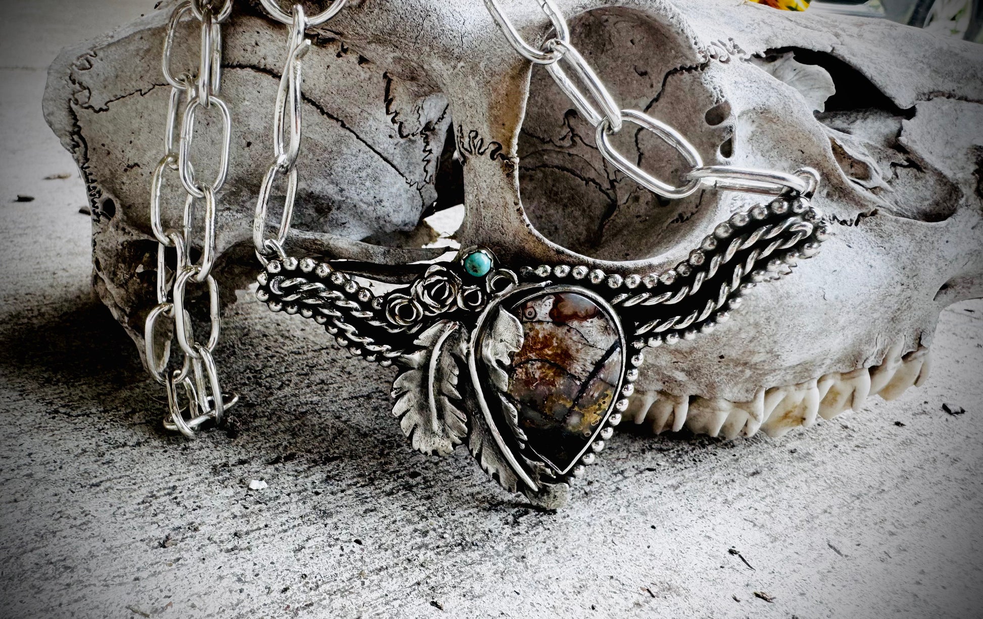 This beautiful agate was the perfect stone for this longhorn piece. Adorned with a small turquoise stone and some beautiful feathers and it is gorgeous. Pendant is approx 4” wide and overall length is 19”. Completely handcrafted with sterling silver and a copper back plate.