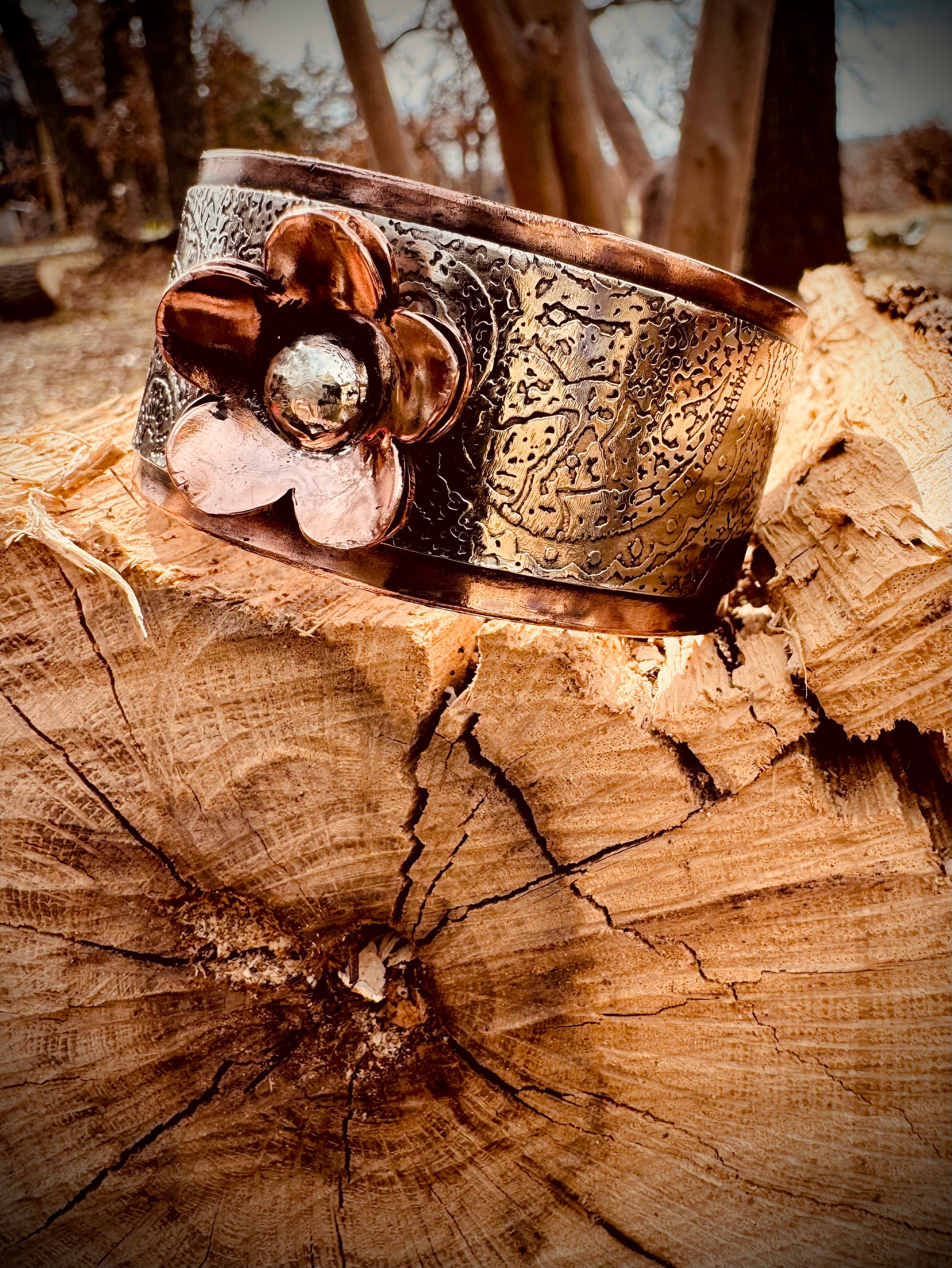 This handcrafted copper cuff captures the beauty of nature with bold, rustic elegance. A wide band of textured metal forms the base, featuring intricate, etched detailing that gives the surface depth and character. The organic patterns create a weathered, artisan feel, making each piece truly one of a kind.